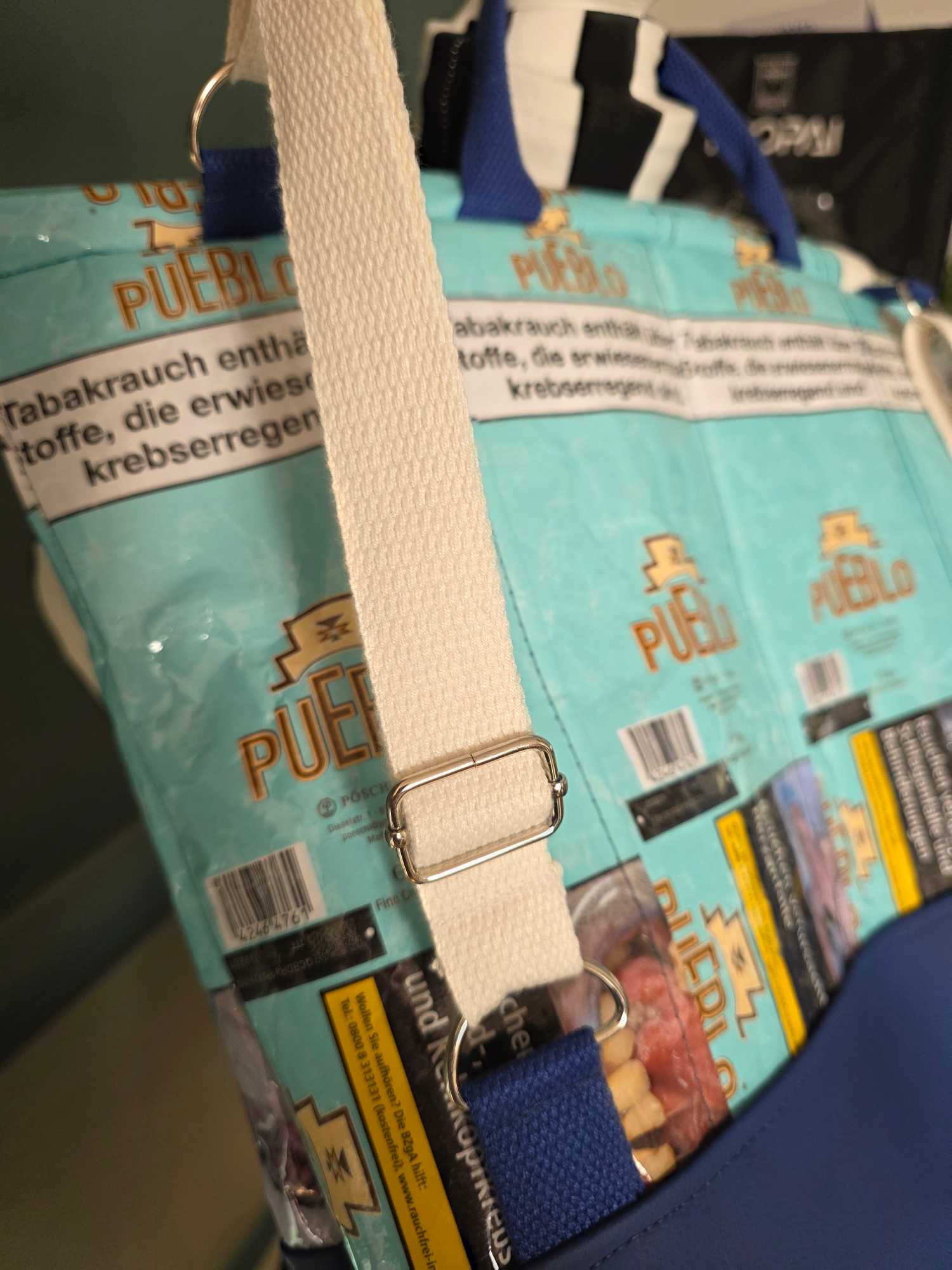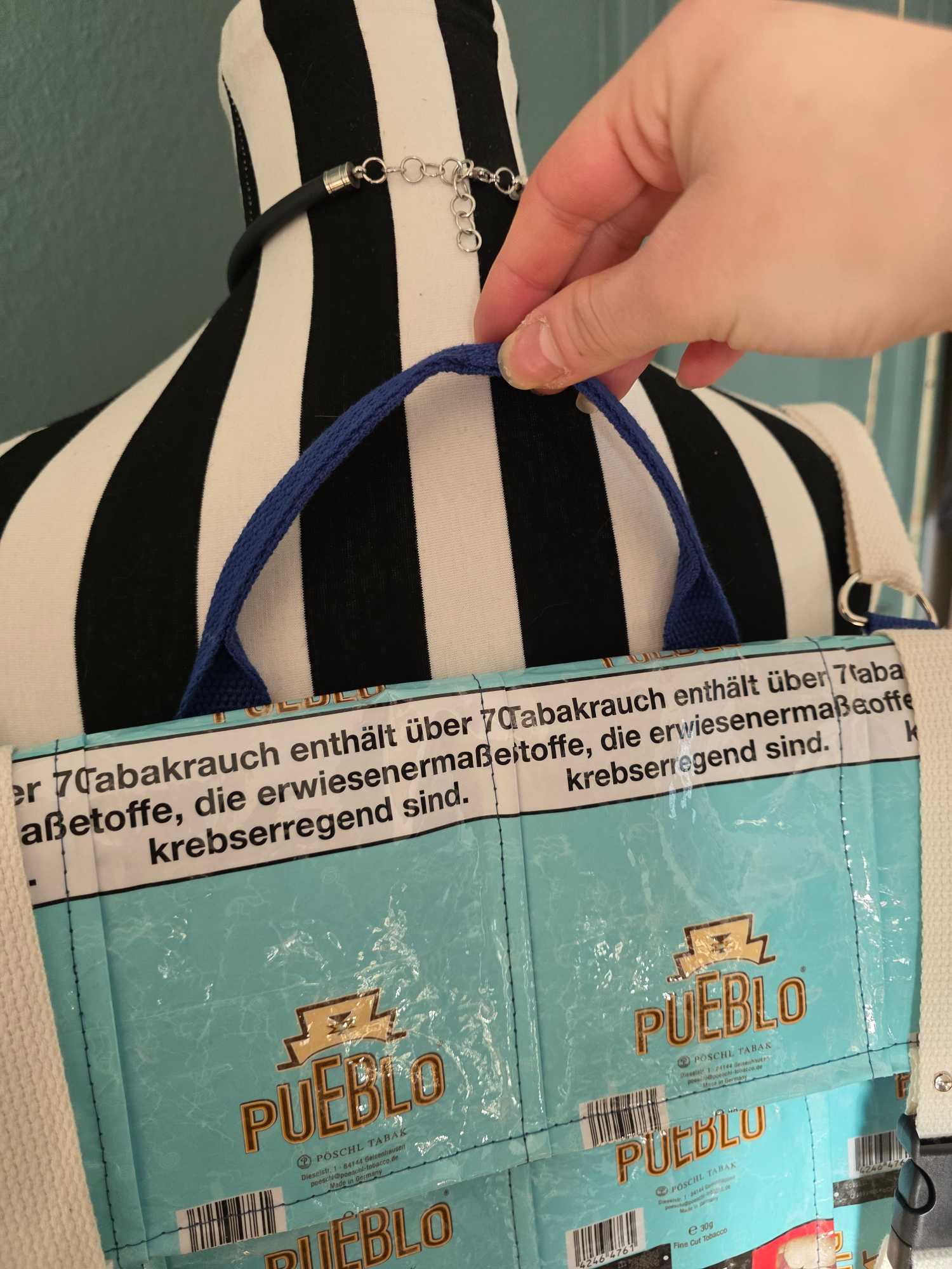 • Outside: Double-laminated upcycled tobacco packaging, combined with faux leather