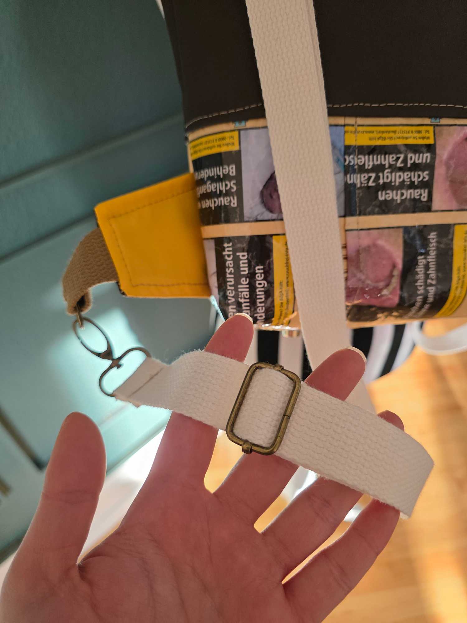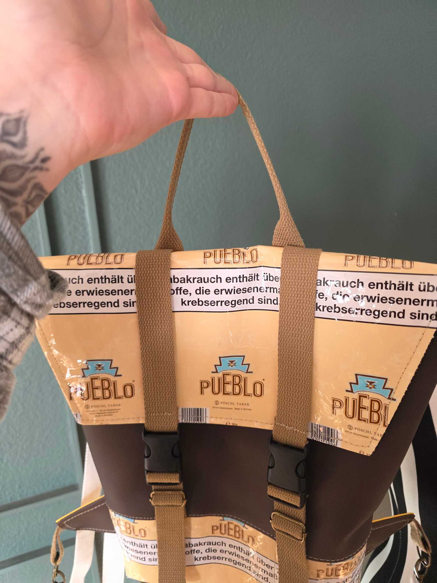 • Outside: Double-laminated upcycled tobacco packaging, combined with faux leather