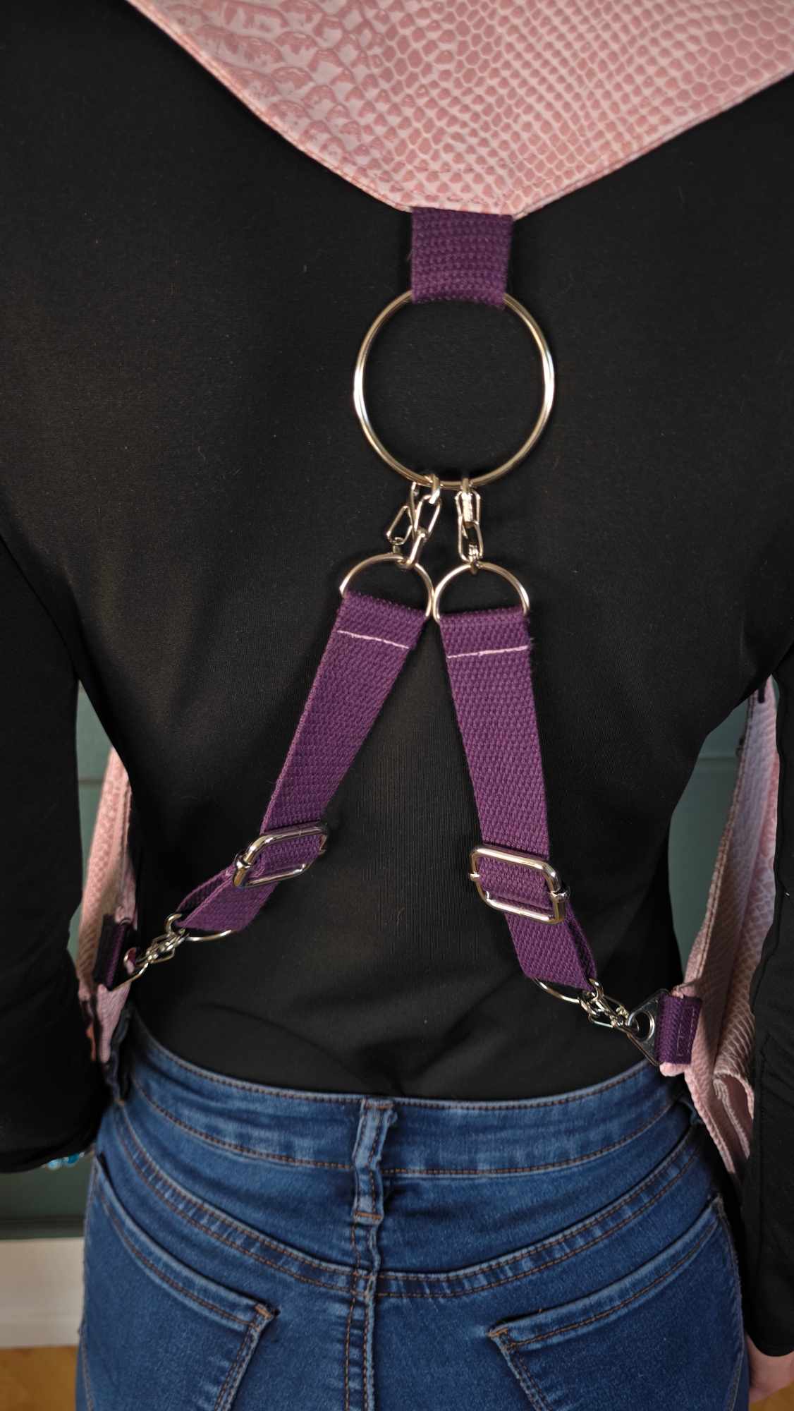 Damit das Teil nicht nur gut aussieht, sondern auch perfekt sitzt, gibt’s verstellbare Polyester-Gurte mit stabilen Metall-D-Ringen. Und weil ein bisschen Drama nie schadet, hab ich noch drei Stahlketten vorne & hinten rangehauen sowie Ösen-Schnür-Elemente für den letzten Feinschliff.
