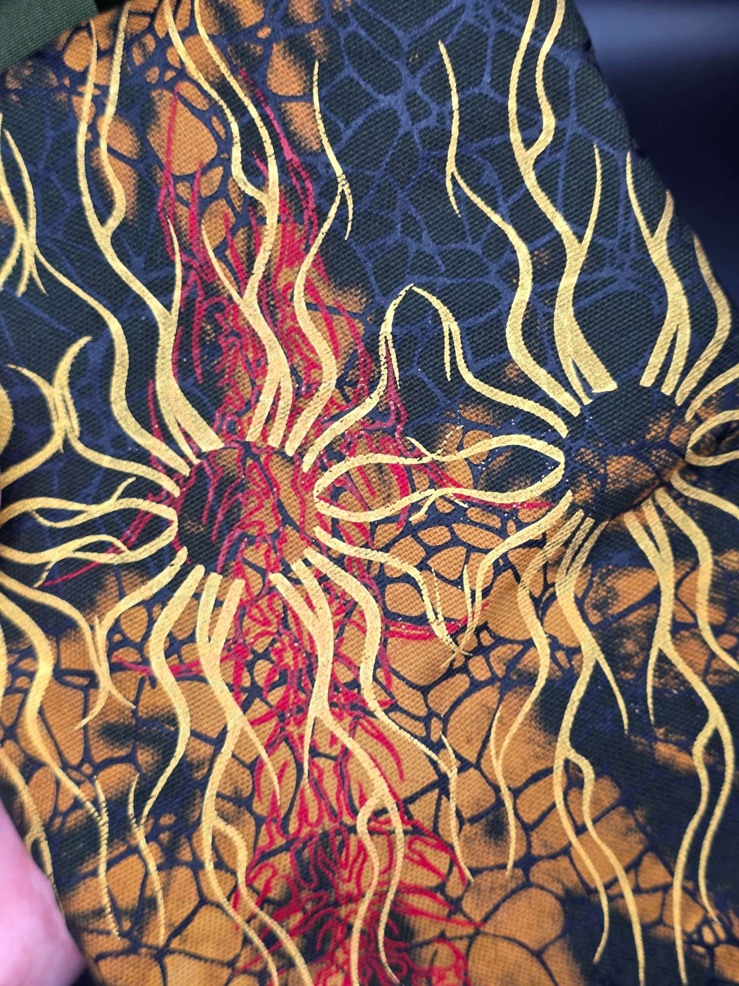 • Print:  screenprint, black pattern, red Tribals, golden sun