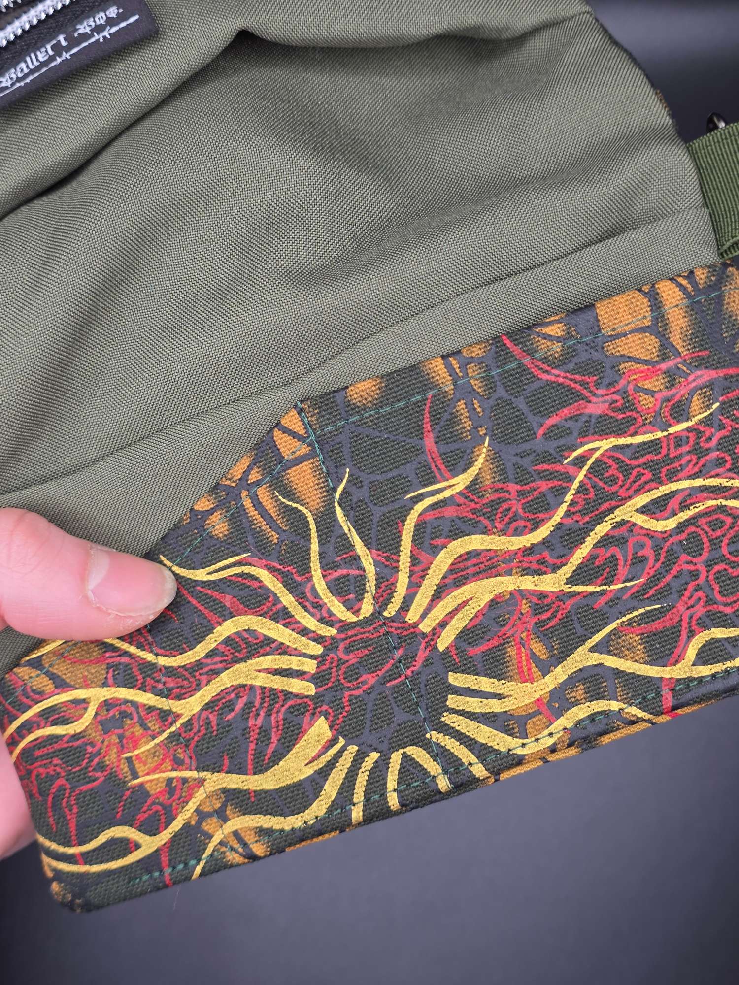 ➡️ Außenstoff: 100% Baumwoll-Canvas, handgefärbt und mit eigenem Siebdruck veredelt – robust und farbecht