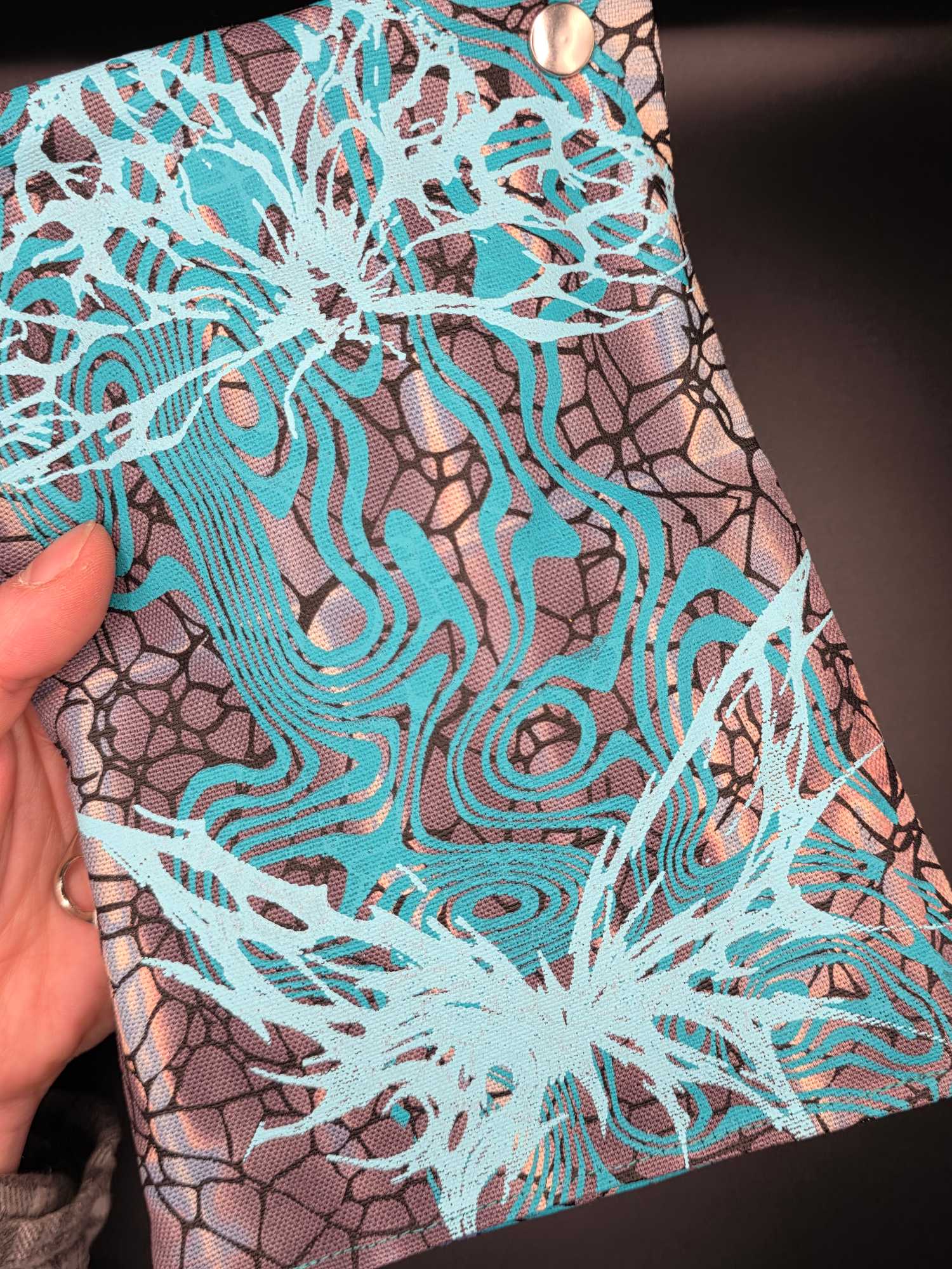 ➡️ Außenstoff: 100% Baumwoll-Canvas, handgefärbt und mit eigenem Siebdruck veredelt – robust und farbecht
